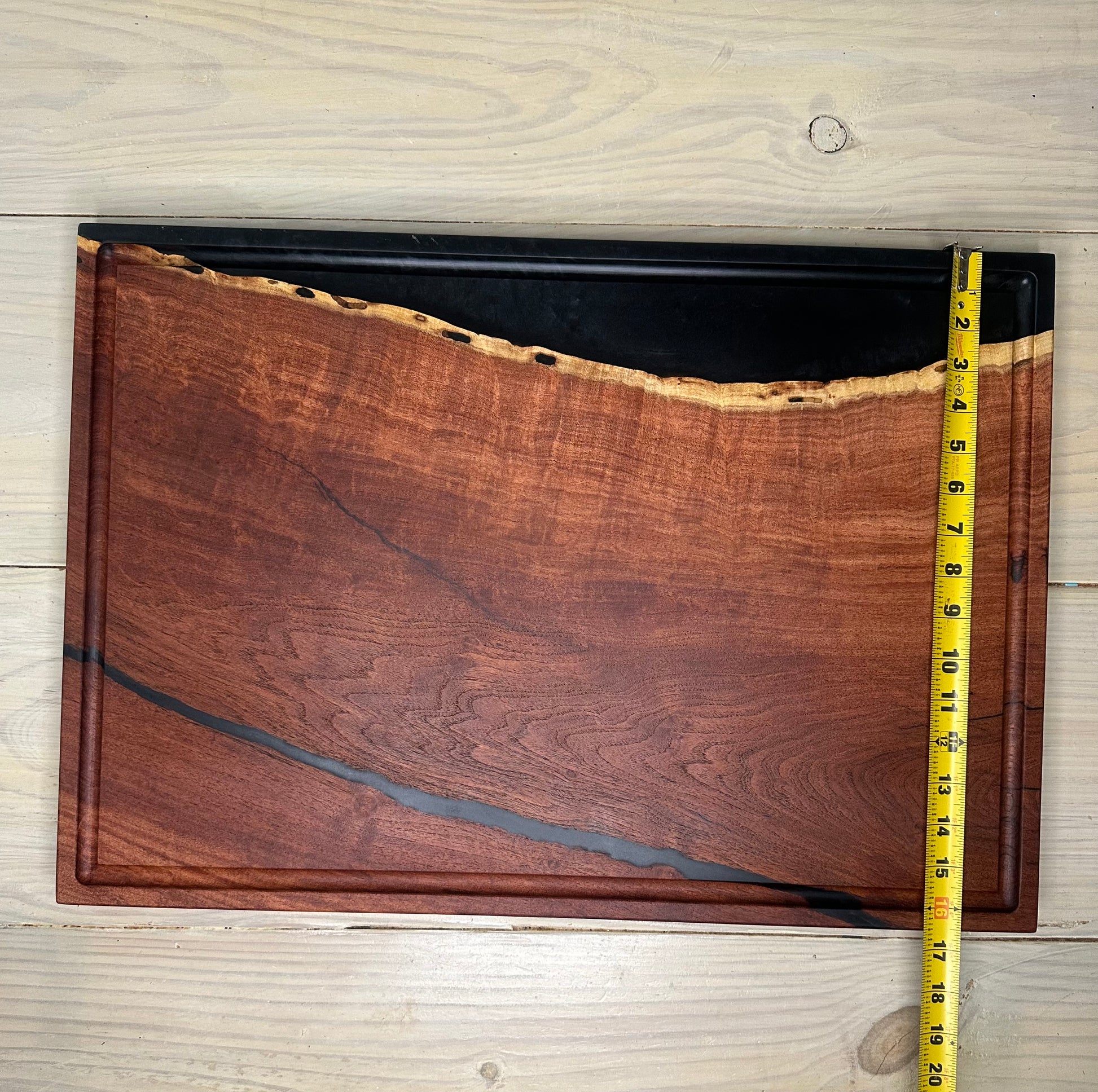 It is made from a single slab of Mesquite (locally milled in San Angelo), filled with high end (food grade) epoxy for the voids and cracks